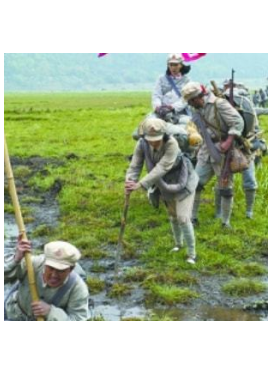 王军华的父亲王宗臻背着长枪,带的粮食都吃光了,饥饿和疲惫又把他和战友带进了一片茫茫草地。所谓草地,都是沼泽地上面生长的杂丛乱草,看上去像草地,其实是泥潭,人掉进去拔都拔不出来。黄昏时突然刮起北风,还夹着阵阵雪花,王宗臻刚迈出几步,前面的战友就踩在沼泽地上,随之往下陷,王宗臻伸出长枪拉着战友,也把自己扯进了泥潭里。前面的战友已经陷到了脖子处,渐渐地看不见了。王宗臻的膝盖拔不出来了,他想到那杆长枪不能掉进去,就把枪甩给后面的战友。自己越陷越深,眼看不行了,这时一位藏族红军战友把一根长绳抛给了王宗臻,众多的战友终于在死神门牙边缘拉回了他一条命。