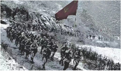 一到下午,气候突然大变。先是大雾,后来又下起了毛毛细雨,不一会又下起了雪。我们冒雪继续往上爬,越往高爬,雪越大,还刮起了大风。指战员们一个个都成了雪人,再加上刺骨的寒风一吹,冻得人不知怎么是好……