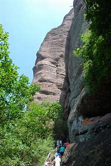 小武当山非常陡峭,经过许多坎坷才慢慢爬到半山腰,这里有一座玻璃桥,工作人员验完票后说:“穿好鞋套,你们就可以去走玻璃桥了。"
