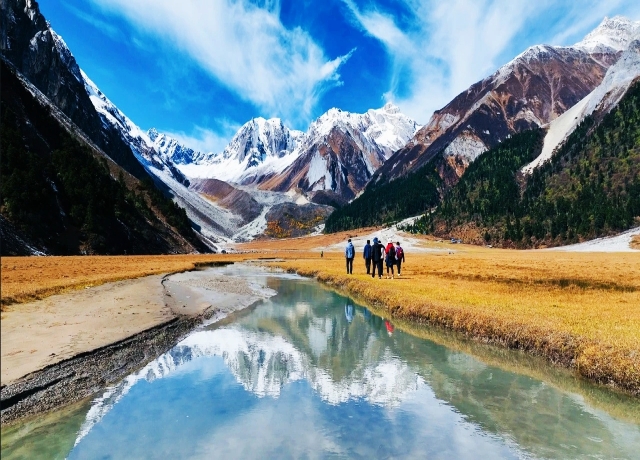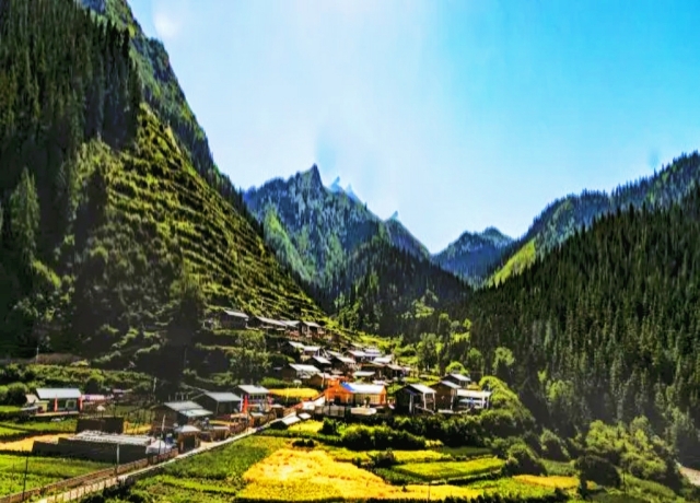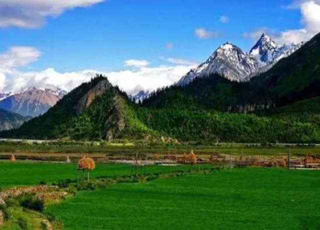 不过,这里的秋景倒也别具一格,头顶上蓝天白云飘浮,脚下大地流金一片,远处松柏林海绵延,原野牛羊嘻戏,相伴雅江涛涛……一点儿也不输陶渊明歌吟的那番世外妆景。