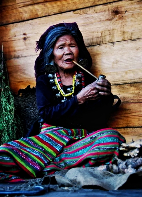 由于这里气候常年温润潮湿,僜人都酷爱自制的烟酒祛湿,喜欢原生态的生活方式。有句话这样概括他们的生活状态:“一半日子在太阳下晒着,一半日子在雨里面泡着,所以男女通常都不穿鞋。”瞧瞧这边巴一家,女的以彩色上衣和横条纹布裙裹体,头发卷在脑后并插着发簪,颈项挂满串珠或银币,手上也没忘记戴上戒指和镯子。男的头上盘着白帕,耳戴银环,腰间佩带砍刀、弓箭和烟袋,上身穿短袖衣衫,下身是短裤。无论怎么打扮,两脚都是光着的。他们说,这里不管男女,穿着用料全是自己纺织的麻布。目前,村里还有个别人仍坚守着传统习惯,下身只有遮羞布,就图个夏秋自在凉爽。