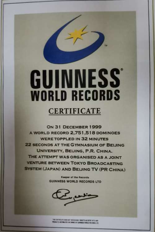 25年前的千禧年之夜,全世界沉浸在欢乐的海洋之中,各地的人们以多姿多彩的庆祝方式,迎接新千年的到来。而来自中国北京的欢庆方式则别具一格,引起世界各大媒体的兴趣。我们北京电视台的迎接千禧年节目《跨越2000》赴国外报道记者在纽约、在伦敦、在悉尼、在里约热内卢、在开罗,通过CNN、BBC都看到了这条消息,这就是北京电视台为新千年降临人间送上的一份特别礼物,即在跨越2000年的一刻,以推倒2751518张多米诺骨牌的成绩打破该项目吉尼斯世界纪录,成为人类迎接新千年庆祝活动中一颗耀眼的明珠。它也作为2000年的第一个吉尼斯世界纪录被永远铭刻在人类历史的记忆中。