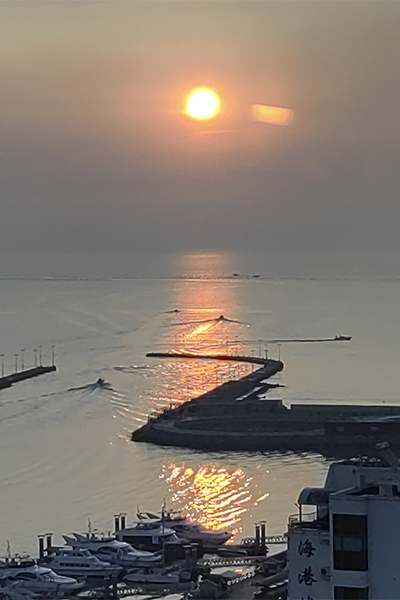 我们四人下榻的是万平口绿舟南路海港城C区三单元1906室。对,就在19层的位置。客厅窗户正对着万平口景区。坐在窗前,俯视万平口的泻湖和无垠的大海,一览无余的风光,像一张巨幅油彩画铺展在眼前。