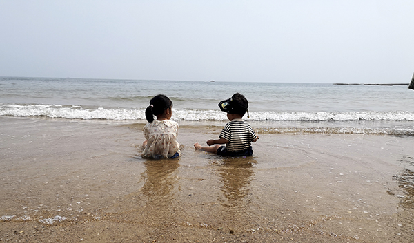 这时,放置在海水边的一大一小两双凉鞋,吸引了我。我马上喊来爱人风信子。她便蹲下身子,以鞋子为前景,往前便是这双鞋子的主人——一对母女在浅水中嬉戏。风信子是个摄影爱好者,她端着照相机,从不同角度抓取了鞋子、母女和大海的风景。车先生和方女士也忙着用手机拍照,留下了许多海边风情。