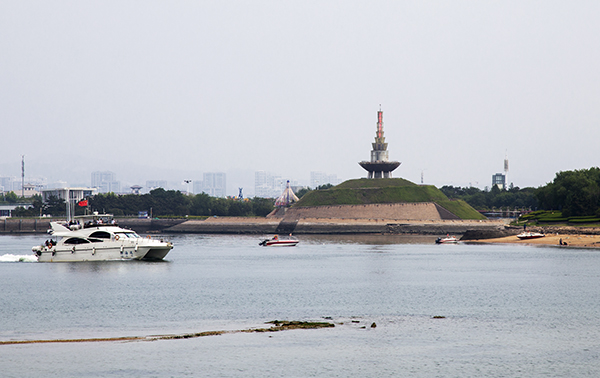 前面就是万平口大桥,这是日照的一架景观大桥。它横跨在万平口的泻湖之上,连接水运会基地南北区域,南边是世界帆船锦标赛基地,北边是奥利匹克水上运动公园,大桥以其独特造型和宏伟规模成为日照的一大标志性建筑。走在大桥上,可以看到南边的泄湖里,有帆船运动员在进行水上训练;北边的泄湖里,好像是在进行皮划艇运动比赛。也许游人并不关心这些风景,而是蜂拥扑向海边,好像是去与情人约会,那样迫不及待。