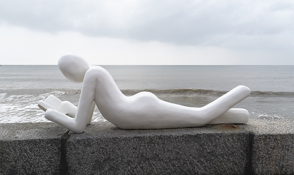 进入大门,便看到一尊巨大的铁锚雕塑,砂石地面散放着几只小木船。在航海博物馆里,展示的有船的模型、海洋文化和航海历史。比较吸引游客的还是“海风书院”区域,靠近海边摆放着一溜排木桌木椅,供游人小憩。这时,一尊人物雕塑吸引了我。这是个抽象的裸体美女艺术,玉石白色。她伏在大石块垒砌的墙体上面,双手捧书,左腿微微抬起,一幅特别自在的样子。我喊来方女士和风信子。她们一看,也惊喜不已,上前合影。在“海洋书社”门前还有一个白色雕塑,是一位男子坐着读书的样子,她们也先后坐在边上,装出与男子一起看书的神情。