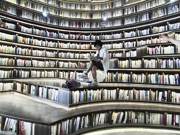 当然,这里最经典的部分是“海边书舍”内的“书山”,是一个到这里游玩必须进行网红打卡的地方。从门口进入,书架是以环状到屋顶布置的,分内外两层,两层间是步道,供人行走参观。在内层,顶部是透明反光玻璃,抬眼望去,书架特别高。摆满书籍的书架有台阶链接,可以登上去,取下一本书,坐在台阶上,作出阅读的样子,拍照留念。
