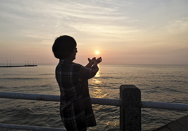 早晨起床,不到四点,我和风信子已穿戴整齐。风信子背着相机,我替她扛着三角架,直奔海边。这时,观景台上已站满游客,都在翘首等待大海日出的时刻。