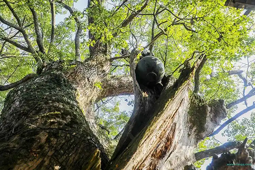 毛泽东旧居后面有个巨大的古樟树。伟人已去,古樟树依然郁郁葱葱。大樟树下,一块石头,上面刻着“毛泽东读书、阅报处(1931—1933)”,说明当年毛泽东经常在这棵古树下读书看报、思考问题。可是,大树的一个枯枝上却悬这一颗炸弹。当然,炸弹是个仿制品。这又是一个怎样的故事呢?梁衡先生在《一棵怀抱炸弹的老樟树》中作了较详细描写: