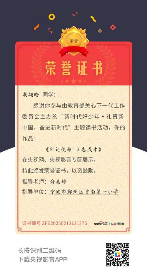 此文被教育部关心下一代工作委员会主办的“新时代好少年?礼赞新中国,奋进新时代”主题读书活动采用,并在央视网、央视影音专区展示。我特别高兴,这是对我的鼓励。从幼儿园开始,我总是想做一个好孩子,上学后,第一批挂上红领巾,现在是班干部,我一定好好读书,成为一名优秀的学生。