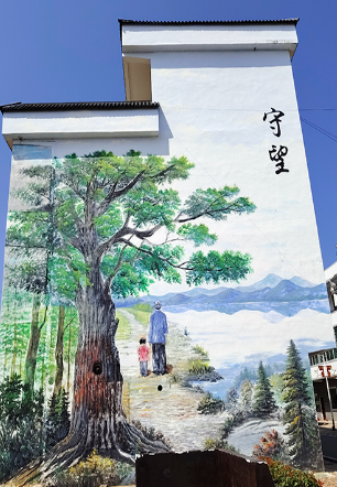 那天,我们刚走近段桂秀老人居住的小楼,便看到一面墙上绘制的巨型彩色画作,古老的大树下,身着蓝衣老人牵着红衣小孩,站在河边,向着小路远望。这便是老人故事的写真。