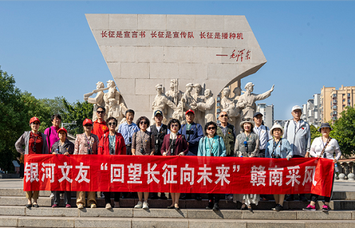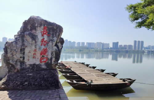 在这个命名为“中央红军长征出发地纪念园”里,耸立着两尊巨型雕塑,一尊为“长征从这里出发”,一尊为“中央红军长征出发纪念碑”。银河悦读中文网站站长李玲女士,带领大家向纪念碑敬献花篮,党员同志进行了“重温入党誓词”仪式。大家移步渡口景区,只见渡口边立着一块巨石,上面是杨成武将军于1983年12月题写的“长征渡口”四个红色大字。靠近巨石的河水里,并排放置6个木船,都用竹笆片连着,有绳子固定在岸边,构成了一道独特风景,游人们纷纷以此为背景拍照留念。