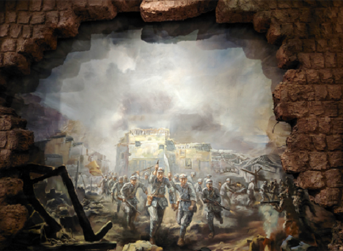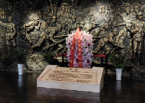 看罢演出,我们便走进近处的“中央红军长征出发纪念馆”,了解更多关于长征的故事。纪念馆的入口,正中矗立着一座大型雕塑,展现了红军战士们英勇无畏、一往无前的英雄形象。大型雕塑前,一只别致的花篮吸引了大家的目光。这是习近平总书记在于都视察时,向“中央红军长征出发纪念碑”敬献的花篮。