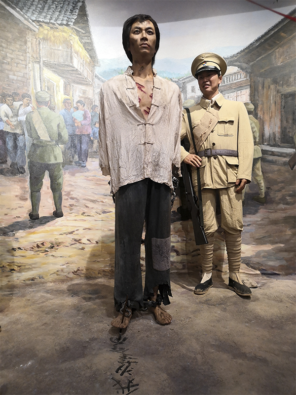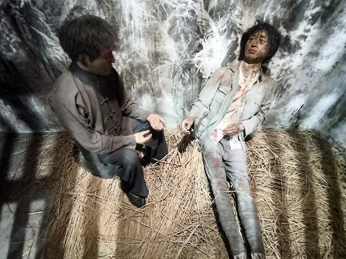 这幅展图,也是以塑像进行的立体布置。烈士马德明被关在小屋里,透过木窗,能看到他被敌人严刑拷打后的状况。他满身伤痕,坐在稻草铺就的地上,上身坚强地斜靠着墙壁,在跟半蹲状的狱友交谈,此处题写着“马德明狱中交最后一次党费”。