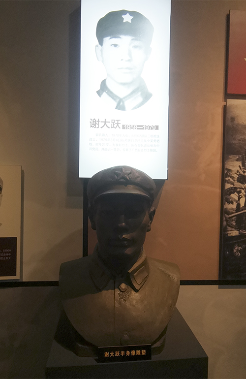 在展厅内,我还注意到一个半身像雕塑,他叫谢大跃。上方是他的一张照片和个人简介。谢大跃是和我们同时代的人,他是1979年对越自卫反击战中牺牲的烈士。