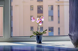 窗外,对面高楼林立,窗户整齐排列,犹如一双双沉默的眼睛,见证着城市的繁华与喧嚣。阳光透过玻璃,洒落在窗台,为花朵披上一层金色光辉。光影在花盆与叶片间跳跃,编织出如诗画面。花影在阳台上轻轻摇曳,仿佛诉说着静谧的梦。