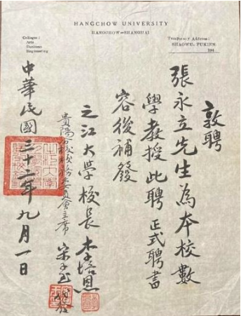 (之江大学校长李培恩1943年在贵阳颁发的聘任书)