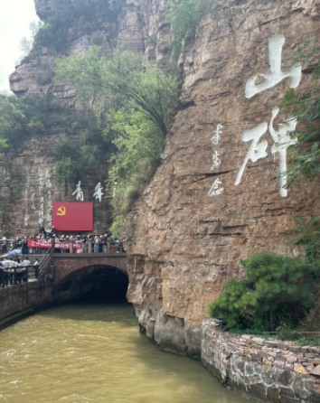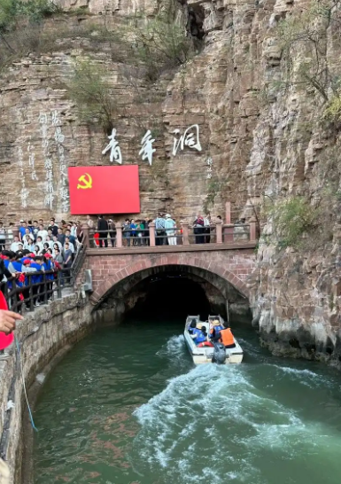 青年洞洞口上方鲜红的党旗紧贴石壁,格外醒目。洞口上方平台,站立着络绎不绝前来观光的男男女女,老老少少。向党旗宣誓的团队,庄严挺拔,声如洪钟;仔细阅读青年洞纪念碑文的人们,热泪盈眶,泣不成声;摄影留念的,仿佛自己也成了开渠的突击队员,骄傲和自豪全都洋溢在精气神里;看着红旗渠中飞速穿梭游艇欢呼的,享受着红旗渠带来的幸福和欢乐……热烈的气氛,进步的力量,让我想到了延安景区。