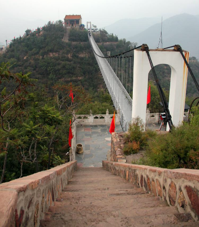 眼前横跨两山之间、深度难测,跨度146米、简易加单跨悬空索的步云桥,似在向我们挑战。山风浩荡,天地悠悠,我们提心穿行,举步惊鸿,正如桥南北两头吊杆门框上“春风扶我腾云过,秋山迎宾驾雾行”“有志敢行天上路,无胆惊看云中人”的对联,既腾云驾雾,惊心动魄,又惊喜我们人行其上,竟平步青云,跨越了过去,不禁感慨万千。