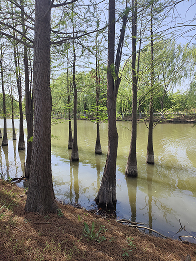 这些年,扬州周边地区的湿地公园去了不少,留在脑子里的美似乎有点饱和,然而,在今年四月天里,当我与一帮文友踏上珠湖湿地,立即被一连串的“意外”撞击了腰。