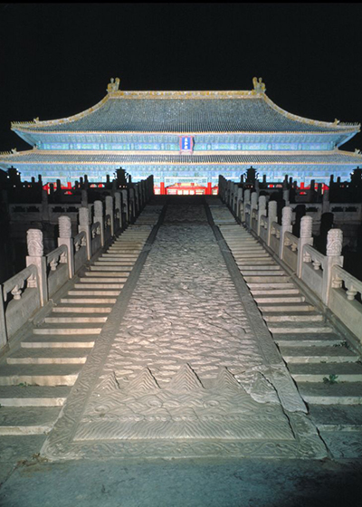 帝举行朝会的地方,也称为“前朝”。太和殿和中和殿、保和殿都建在汉白玉砌成的8米高的工字形基台上。太和在前,中和居中,保和在后。远望犹如神话中的琼宫仙阙。基台三层重迭,每层台上边缘都装饰有汉白玉雕刻的栏板、望柱和龙头,三台当中有三层石阶雕有蟠龙,衬托以海浪和流云的“御路”。用这样多的汉白玉装饰的三台,造型重迭起伏,这是中国古代建筑上具有独特风格的装饰艺术。