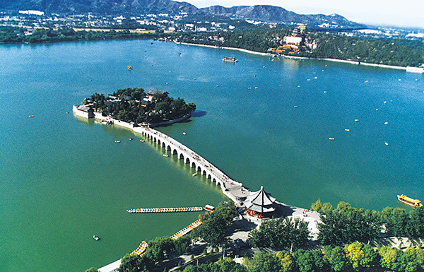 间,像一条长虹横架在粼粼碧波之上。据说,它是仿卢沟桥之作。始建于清乾隆十五年(1750),是我国皇家园林中现存的最长的桥,因有十七个桥券洞而得名。桥头及桥栏望柱上雕有五百多只形态各异的石狮。桥栏的两端有四只石雕的异兽,威猛雄健,当属清代石雕艺术品中的杰作。我行走在十七孔桥上,看着这些静观游人的石狮子,顿然心中有一种历史沧桑感。走过150 米长的石桥,便进入风景优美的南湖岛。我们在这个面积有16 余亩的小岛上, 游览了涵虚堂和龙玉庙等古建筑。据说,涵虚堂的造型颇像武昌的黄鹤楼, 原有三层阁楼, 当年清代帝后每年在这楼上观看水师操练。