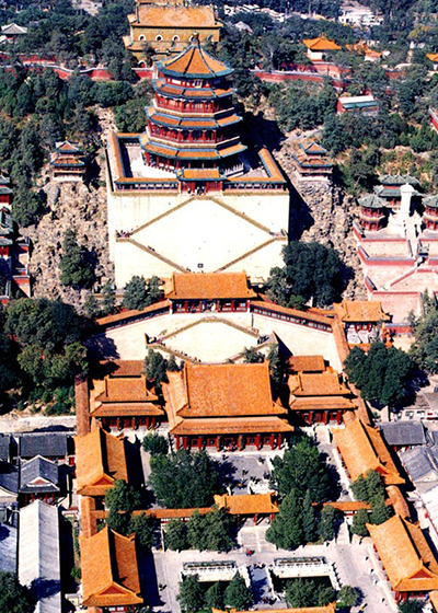 拜别“千手观音”,我来到了佛法世界——“智慧海”。这是清乾隆时期(1736-1795)的建筑,用砖石发券砌成,不用梁柱承重,又称为“无梁殿”。打眼一看,“智慧海”可谓金碧辉煌,通体用五色琉璃砖瓦装饰,色彩绚丽,图案精美,尤以嵌于殿外壁面的千余尊琉璃“无量寿佛”更富特色,显示着佛法世界万千智慧。它们和殿内佛像均为乾隆时文物。挨近“智慧海”就是砖石结构的“众香界”宗教牌坊,牌坊表面用五色琉璃瓦件装饰。在牌坊的正、反面石额和智慧海的前、后石额上,分别刻着:“众香界,祗树林;智慧海,吉祥云”,将这里比作佛门圣地。站在这里,真由不得自己,你的内心肯定怀有一种虔诚之心,面对众多佛像,双手合十,默念心中所求。再往前走,就是山的另一面了,远望湖光山色,近观佛塔林立。我在塔林里穿梭,竟然一时迷了返回的路,折腾好一会儿,方重新站在了佛香阁处。这是俯视万寿山前景,就发现了乾隆皇帝的曾经梦境:“福山寿海”。你看,眼前的昆明湖真像个大寿桃。还有一说万寿山呈蝙蝠状,另一说是佛香阁及其两边长廊呈蝙蝠状。这里的“蝠”同“福”音意。我不由得啧啧赞叹,无论是从下往上仰视还是从上往下俯视,万寿山上层层升高的宏伟建筑,都充分展示了这座皇宫御苑的皇家气派。