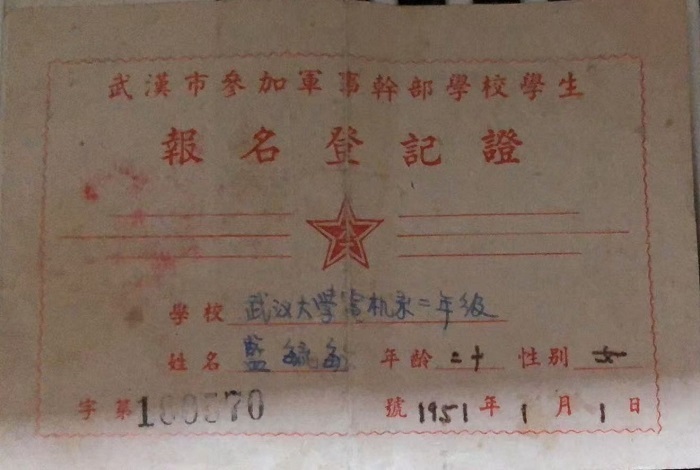 1950年,抗美援朝的战火燃起。正在武汉大学读大二的妈妈,那届武大电机系唯一的女生,毅然响应祖国号召投笔从戎,立志要奔赴抗美援朝保家卫国的最前线。