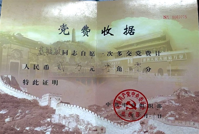 妈妈还向党组织交了两万元的特殊党费,当收到北京寄来的党费收执时,看到上面盖着中组部的大红章,妈妈非常高兴和欣慰。