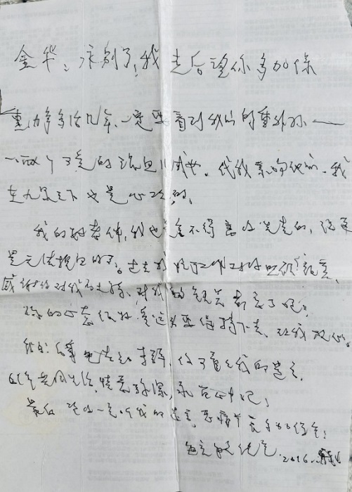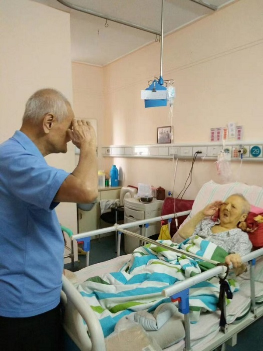 在生命最后的日子,我把老爸爸接到病房,那是二老最后一次见面,妈妈拉着爸爸的手,已经无法说话,在爸爸准备离开病房时,妈妈吃力的举起右手,敬起了军礼。90岁的老爸站在床边,也向妈妈回敬军礼,两个老军人就这样默默对视,用他们为之奉献一生的最高礼节相互道别,一旁看到这一幕的我被震撼了!赶紧拿起手机为二老记录下这最后的军礼!后来这张照片从我的朋友圈被无数人转发,很多陌生的人跟我联系,表达对两位老人的敬意。军礼后一周,2016年9月24日6时30分,85岁的亲爱的妈妈永远离开了我们,她老人家留给我的最后六个字是:知足了,该走了……