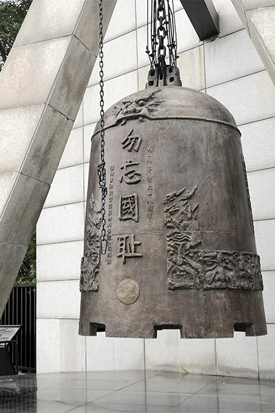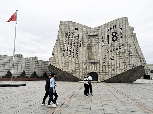 在博物馆外一角,我看到一些石碑,都是日本侵华的罪证实物。如“奉天忠灵祠石碑”“八幡大神石碑”等,特别是“柳条湖“炸弹碑”,由钢筋混凝土制成的石碑,形似一枚扎入地面的炸弹。这块碑高661厘米,由基座、碑身和碑顶三部分组成,底部为六棱柱,上接Y字形棱柱,顶部向外分为三叉,形状独特。