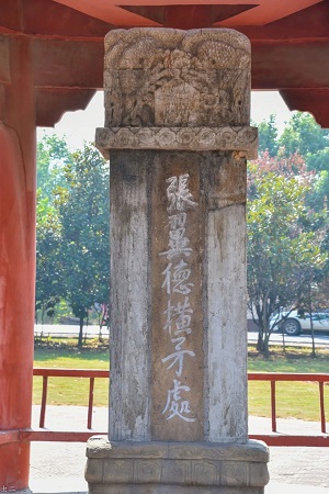 长坂坡东北有座坝陵桥,这里是长坂坡大战另一个重要战场遗址。此处建有一座黄瓦红柱六角亭,内有清雍正九年(1731年)所立石碑,上刻“张翼德横矛处”。至今保存完好。这里便是张飞横矛立马、独退曹兵的地方。如今虽已不见当年的湍急河流,然立于桥头,张飞那震慑敌胆的威猛气概,依然扑面而来。据传当年张飞在桥头拦截曹军,瞪大眼睛,横放长矛,威声一喝:“吾乃燕人张翼德也,谁敢与我决一死战。”其声如巨雷,桥应声而断,竟吓得曹操部将夏侯杰肝胆碎裂,坠马而亡。有人怀疑故事真实,然《三国志·张飞传》确载:“先主闻曹公卒至,弃妻子走,使飞将二十骑拒后。飞据水断桥,瞋目横矛曰:‘身是张益德也,可来共决死!’敌皆无敢近者,故得幸免”。于是曹操下令全军撤退。如此看来张飞“断桥退曹军”是史实有据,不过桥是否喝断证据不足。现代科学证明桥梁可能会被声音震断,但不在于声音分贝高低而在于是否“共震”。史书“飞据水断桥”的留白,正给罗贯中留下了充分想象发挥驰骋文思的的空间。《三国演义》说:“只见张飞倒竖虎须,圆睁环眼,手绰蛇矛,立马桥上,又见桥东树林之后,尘头大起,疑有伏兵,便勒住马,不敢近前。”原来这位性情刚烈的猛将,看似粗犷,实则粗中有细——他事先命令部下将树枝绑在马尾上,让马匹在桥后树林中来回奔跑,搅乱掀起尘土,制造大军埋伏的假象,曹操难辨真假害怕遭到埋伏乃退兵。谁说张飞一介莽夫,如此威武霸气加巧设疑兵,一代枭雄之孟德竟被鲁莽粗犷之翼德玩弄于股掌之中。曹操文韬武略不差,唯生性多疑,果然中招,错失了活捉刘备的绝佳良机!