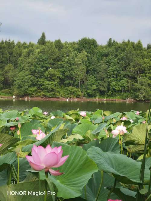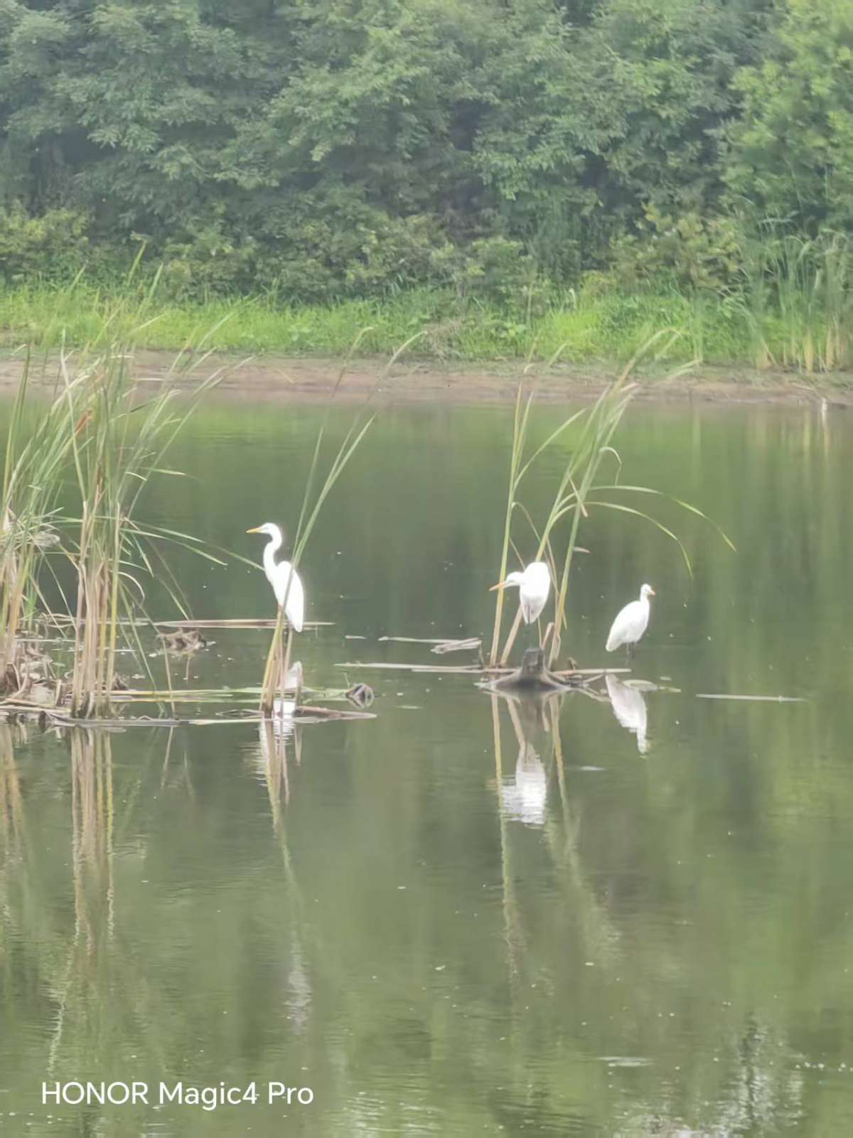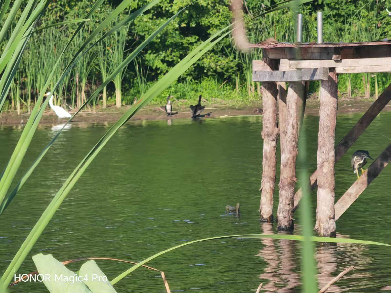 有一天早上,我在荷塘边沿等待偷拍苍鹭或鸬鹚翩翩起舞时,偶然抬头发现天空翩翩飞来十几只大鸟,我马上习惯性举起手机最大化追拍录像,可惜他们飞过库向北面飞去了,因为站在荷塘边沿,视野受限制无法再追拍,正在遗憾时,发现他们又折返回来了。激动的心啊,颤抖地手,我兴奋地继续举着手机追拍,原来是他们发现了杨树上那十几只苍鹭,也要下来分一杯羹。当十来只白鹭翩翩落下来那一刹那间,脑海里突然闪起小时候看过的老电影里七仙女翩翩下凡的画面,仙气飘飘!当这十来只白鹭落在树上或是浅水区觅食,苍鹭和白鹭同框出现在一副画面里,我才清晰地对比出来这两种涉禽的色差有多大!这群白鹭停下来在岸边觅食,我也有机会抓拍到大长腿大长嘴白衣仙子早餐觅食小鱼儿的画面。