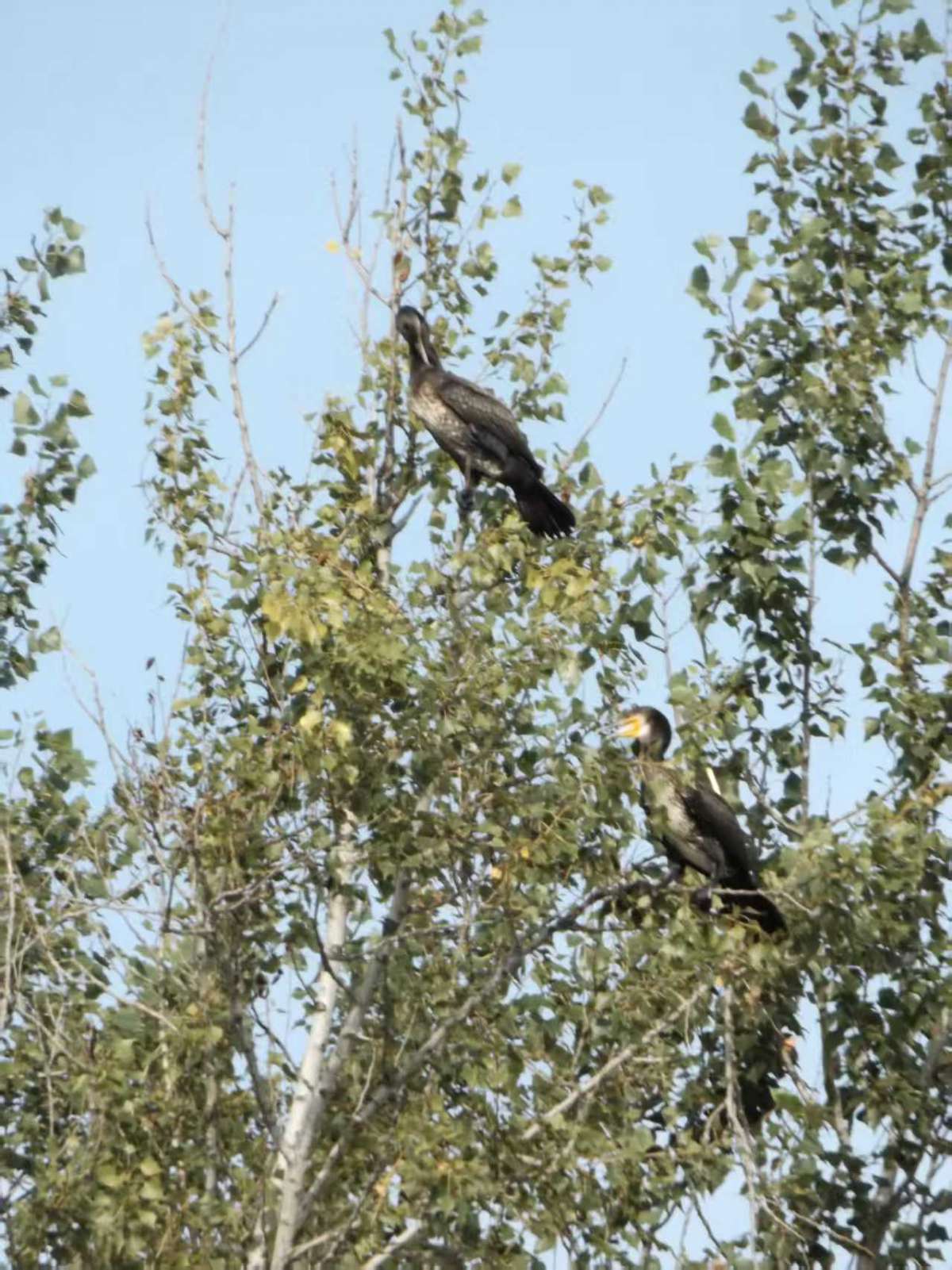 功夫不负有心人,从第一天仅仅看到树上落的一只鸬鹚起,两只,三只,最多时发现树上有六只!鸬鹚们吃饱了飞落在高高杨树上休息时,首先要晾晒下乌黑发亮的双翅,展开翅膀时还要用力抖一抖,然后用黄色的大长嘴梳理羽毛。那几只苍鹭落在树上就老实多了,没这么多表演节目。当然鱼鹰这些“毛病”和他们潜水捕鱼的生活习性有关,而苍鹭白鹭夜鹭等涉禽是习惯在水岸边浅滩区捕食小鱼的,鱼鹰的嘴不算太长,然而胃口很大!观察次数多了,渐渐地,也有机会拍录到鱼鹰在水面潜水捕鱼和从树上飞上飞下的画面。其飞行姿态没有白鹭苍鹭般翩翩优雅,大翅膀子却十分有力量,视觉其飞翔的感觉比野鸭子有力量,但是没听过他们像野鸭子一样嘎嘎地叫,而苍鹭在发现险情报警飞离时常常会发出类似家鹅大雁一样响亮的嘎!