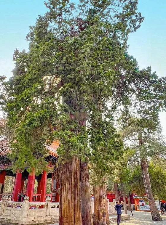 脚下落叶绵软,踏之沙沙作响。阳光穿透枝叶,洒下斑驳光影。粗壮古柏需三人合抱,树皮裂痕似老人掌纹,标牌标注 “东周遗植”。触摸时树脂粘手,似悄然触碰到时间脉络。