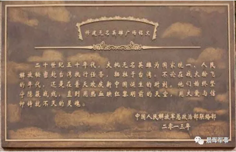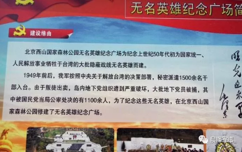 2013年12月底,由原总政治部联络部建设的无名英雄纪念广场,是为了纪念上世纪五十年代为国家统一、人民解放事业牺牲于台湾的大批隐蔽战线无名英雄。这是官方第一次以纪念广场的形式公开纪念那段封闭的历史,公开为隐蔽战线烈士建纪念广场也是第一次。