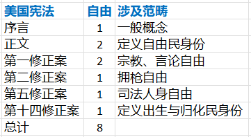 自由两字在美国宪法出现三次,序言一次,正文两次。至1992年,美国通过了27条宪法修正案,自由两字在修正案出现5次。概括如下,