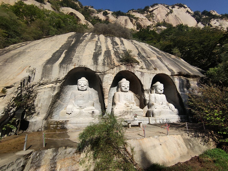 三世佛像雕刻在山脚下的一块巨石上,有三尊佛像趺坐在三个石窟中。佛像面目慈祥,双目微闭,似在俯视人间芸芸众生。佛像胸前都有一个卍,这是佛教的吉祥标志。武则天长寿二年(公元693年),规定此字读“万”,含义为“吉祥万德之所集”。