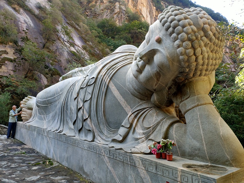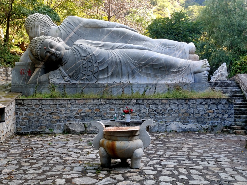 巨大的双面卧佛其实是背靠背侧卧的两尊释迦牟尼佛雕像。卧佛是佛教艺术中常见的表现形式之一,它以释迦牟尼佛临终前躺在娑罗双树之间的姿态呈现,这种形象不仅具有深刻的宗教内涵,还蕴含着丰富的寓意和象征意义。卧佛的姿态表现出一种极致的平静与安详,象征着佛陀在达到最终解脱时内心的宁静。这种平静超越了生死轮回,是一种彻底的内在平和,代表着生命的终结和灵魂的升华。它提醒人们正视生命的有限性,并寻求精神上的永恒与超越。尽管处于涅槃状态,但卧佛依然散发出智慧和慈悲的光芒。这表明即使在生命的终点,佛陀的智慧和慈悲仍然普照众生,给予人们无尽的指引和安慰。它通过独特的形象和寓意,向世人传达着关于生命、死亡、智慧、慈悲和宇宙和谐的重要信息。
