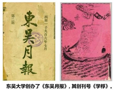 ②1906年6月东吴大学《学桴》创刊,是中国最早的大学学报之一。《学桴》粉红色的封面上,翻滚的波涛中一叶扁舟乘风破浪前进,船首一青年昂首挺立极目远眺,船尾一人掌舵扬帆,桅杆上风帆鼓舞,“学桴” 二字醒目夺人,桅杆顶端锦旗高悬,上书“东吴月报”四字。