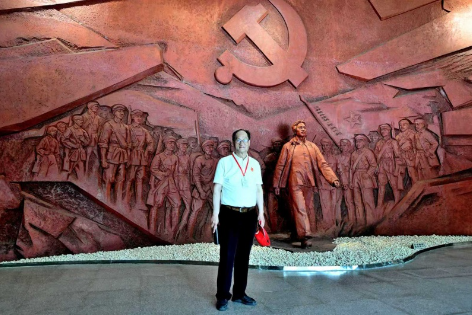 参观完展览,大家来到连接左右两个巨大展厅的高层平台上,在以毛泽东与朱德为主体、众多革命先辈英勇奋斗画面构成的雁翅型巨幅雕塑前合影,留下珍贵厚重的敬仰和纪念。