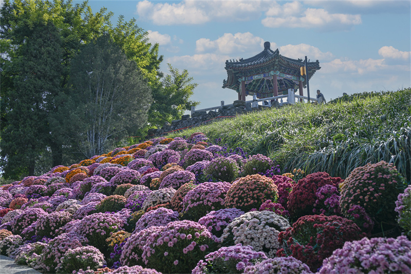 近十万株千头菊,正迎风绽放,层层叠叠,如霞似锦,熠熠生辉。红的似火,黄的如金,粉的若霞,紫的如烟……十几种色彩交织在一起,仿佛大自然打翻了调色盘,泼洒出一场盛大而温柔的秋日告白。这是日坛公园2025金秋游园会的“C位”——菊花谷。