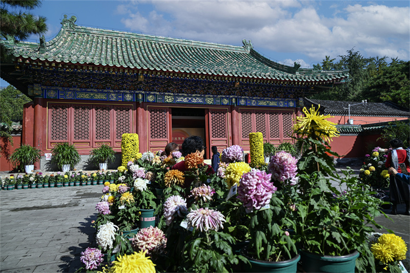 若说菊花谷是自然的狂想曲,具服殿内的“百菊展”则是一首古典诗。几百株独本菊与红墙黛瓦相映,历史与花韵共舞。明清时期皇帝祭日时更衣休息的具服殿,朱红宫墙、黛瓦飞檐。秋日的菊花与这份厚重的历史相遇,菊花的灵动与古建筑的庄重形成了奇妙的和谐。