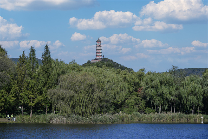 仲秋一日,天朗气清,果香馥郁,我踏入北坞公园采风。首先映入眼帘的是“高湖塔影”这一迷人景点。伫立湖畔,遥望玉泉山,峰塔倒映碧水,构成一幅流动的山水长卷。晴空如洗,云影徘徊,为这幅自然佳作添了几许诗意。山色青黛,湖光潋滟,每一帧皆如诗中逸笔,让人沉醉难返。