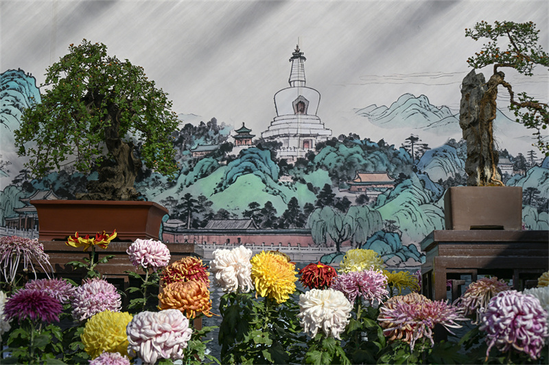 展台上特别推出的“期颐” “快雪” “琼华” “太液”等新品种,以独特的色彩和姿态绽放着迷人魅力。三进院中,龙菊、球菊与菊花盆景各展风姿,室内展厅里的菊花插花作品更是雅致精巧,为游人奉上一场视觉与艺术的盛宴。