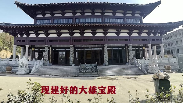 由于大雄宝殿修建基本完工,就差最后一道工序了,既为菩萨贴金。大雄宝殿正中已塑好了横三世佛,既中间释迦牟尼佛、左边消灾延寿药师佛、右边南无阿弥陀佛,而释迦牟尼的两大弟子紧侍左右,左边年老的名叫迦叶尊者,右边中年的名叫阿难尊者。横三世佛背后是观世音菩萨塑像,大殿左右两边墙壁上分别建有五层的五百罗汉塑像,大雄宝殿它不仅象征着佛法的庄严与神圣,更是僧众日常修持的重要场所。