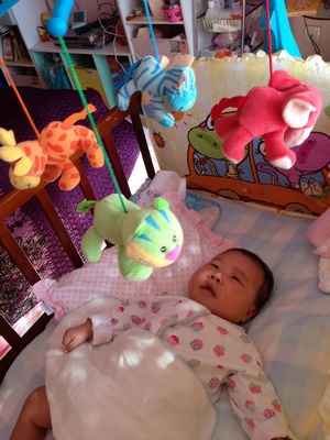 第二个玩伴,是我去香港时特意为芽芽带回的动物悬挂“转伞”。转伞的支架可以牢牢夹在床沿,伞面下悬挂着四只色彩明快的小动物——红彤彤的大象、橙灿灿的梅花鹿、绿油油的小老虎,还有蓝盈盈的斑马。拧紧发条后,悠扬的儿童乐曲便会流淌而出,四只小动物也会伴着旋律缓缓旋转。起初,芽芽对这个会转会唱的小玩意儿毫无兴趣,很少抬头张望。可这几天,只要吃饱喝足、醒着躺在小床上,她就会定定地盯着旋转的小动物,偶尔还会露出甜甜的笑容。更有趣的是,有时我们正忙着,忽然听见她发出“嗯嗯”的哼唧声,过去一看才发现,原来是转伞的音乐停了、小动物不转了。重新拧紧发条,音乐与旋转再次开启,她便又安安静静地看得入神。
