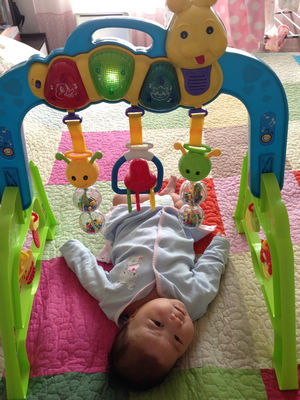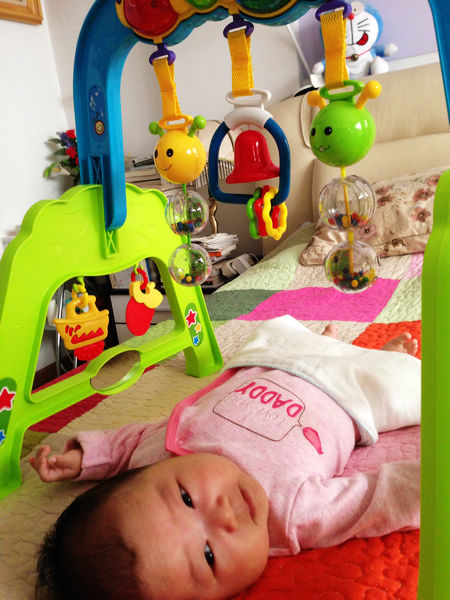 现在每天我都会抽出一段时间,打开健身架,让“虫虫”给芽芽讲故事、唱童谣。听着小公鸡“喔喔啼”、小猫“喵喵叫”、小鸭子“嘎嘎笑”,芽芽仿佛真的能听懂一般,常常开心地在床上手舞足蹈,偶尔还会努力扬起小手,想要去够那些可爱的小挂件。只可惜她年纪太小,小手怎么也够不着,那努力的小模样,实在惹人怜爱。