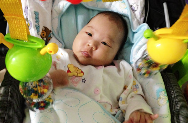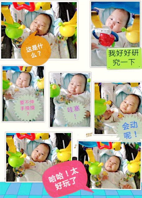 伴着悦耳的音乐,她会裂开小嘴笑,还会有意识地伸手去碰触悬挂着的透明塑料球——想来是球里五颜六色的小豆豆,勾起了她满满的好奇心。每一点进步,都令我们欢欣鼓舞好一阵。
