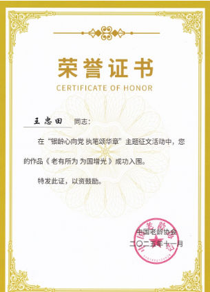 此文在银河悦读获得多位文友的热情评论和点赞,给予我很大的鼓舞。特别是独上月楼站长在评论中不仅对我大力赞扬,而且留下了一句“相信参与征文活动必获奖”的预言。当时我的回复是:“盼望您的这个预言应验!”月楼的神机妙算果然应验,这篇作品真的获奖了!12月8日,中国老年杂志社在“银龄行动”专栏刊登了我的这篇作品,作为最终入围的50篇作品之一。12月12日,我收到了中国老龄协会颁发的荣誉证书。